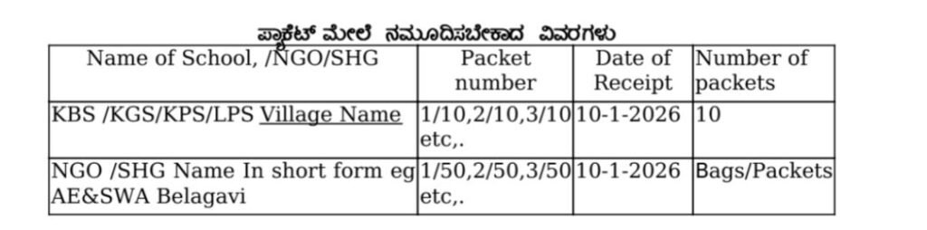 8. ಪ್ರತಿ ಶಾಲೆ/ಎನ್.ಜಿ.ಓ/ಸ್ವಸಹಾಯ ಸಂಘದವರು ಸ್ವೀಕರಿಸಿದ ತಕ್ಷಣ ಪ್ಯಾಕೆಟ್ಗಳ ಮೇಲೆ ಕಡ್ಡಾಯವಾಗಿ PERMANENT MARKER ನಿಂದ (ಅಳಿಸಲಾಗದ ಶಾಯಿ)ಯಿಂದ ಪ್ಯಾಕೆಟ್ಗಳ ಸಂಖ್ಯೆ ಸಂಸ್ಥೆಯ ಹೆಸರು ಪೂರೈಕೆ ಮಾಡಿದ ದಿನಾಂಕ ಕಡ್ಡಾಯವಾಗಿ ನಮೂದಿಸತಕ್ಕದ್ದು. ಹಾಗೂ ಈ ಕೆಳಗಿನ ಪದ್ದತಿಯಂತೆ ಬಳಸುವುದು ಹಾಗೂ ವಹಿಯಲ್ಲಿಯೂ ನಿರ್ವಹಿಸಲು ಸೂಚಿಸಿದೆ.